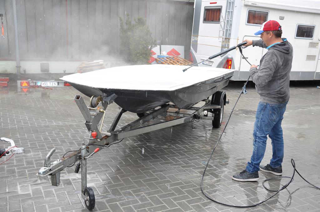 În curtea Hiros Yacht urmează operațiunea de spălare a ambarcațiunii, praful din fibră de sticlă fiind îndepărtat în totalitate.