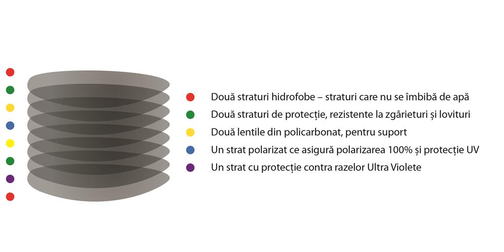 Pentru a putea fi într-adevăr de calitate, o lentilă trebuie să fie construită din mai multe straturi, fiecare având un rol foarte bine determinat. De obicei “stratul” polarizat este asezat în mijlocul lentilei, acesta fiind acoperit de o parte și de cealaltă de alte straturi de protecție. Toate aceste straturi combinate într-o singură lentilă asigură o claritate a imaginii perfectă, un contrast foarte bun și protecție 100% împotriva razelor UV, cu alte cuvinte confort la pescuit.
