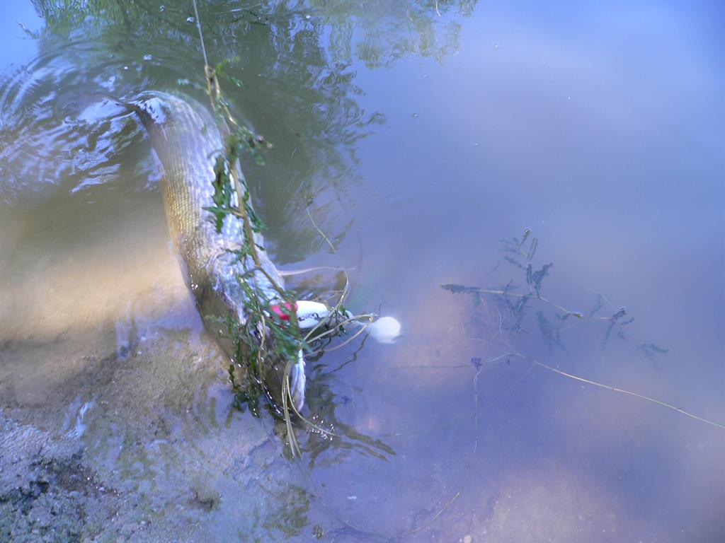 Urmatoarea intalnire cu gumele mari a fost pe lacul Putineiu-La Conac. Primavara si vara, caldura mare. Un lac mic, de vreo 2 hectare, ceea ce multi ar denumi (pe drept cuvant) un lighean suprapopulat cu stiuci mici si, mai ales, mari. La prima iesire am aruncat in apa un Shad GT de 13 cm alb cu capul rosu si imediat am prins prima stiuca, care reprezenta si recordul personal (foto 1). Era cea mai mare guma pe care o aveam la mine, dar la urmatoarea partida am venit cu artileria grea.